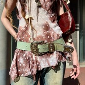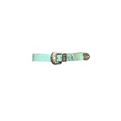 淡いターコイズグリーンに型押し模様が入ったリアルレザーに、装飾が贅沢に施されたシルバーバックルが輝きます。