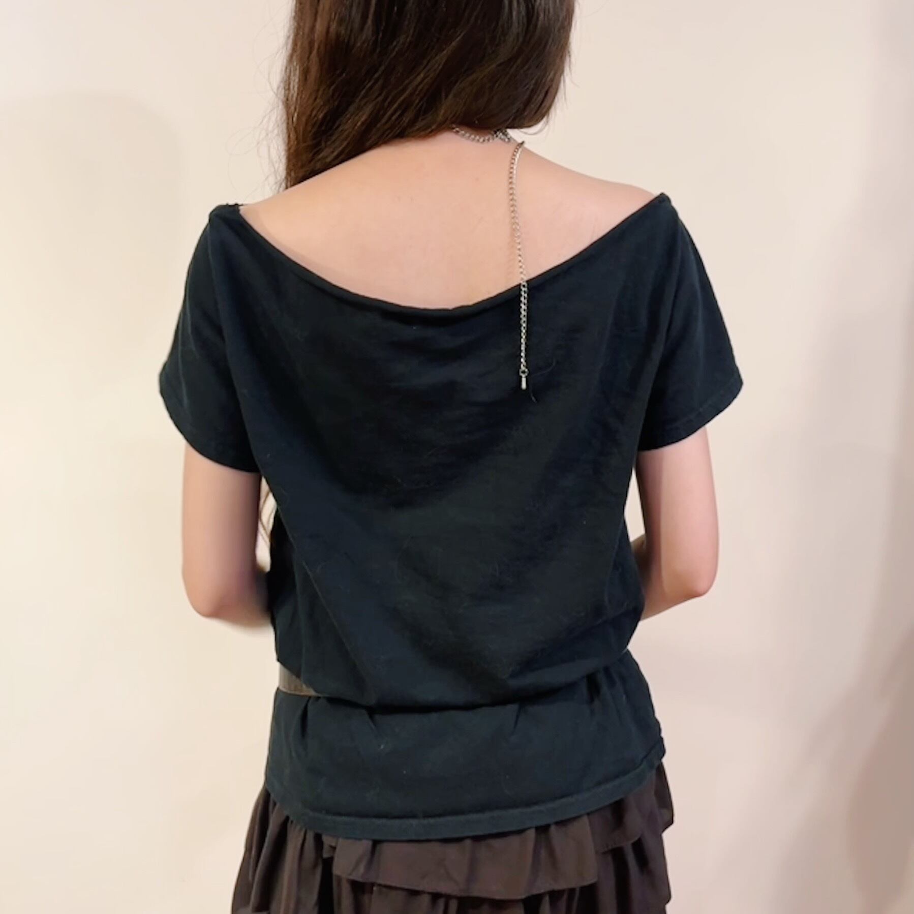 フロントには印象的なポスターアートが大胆にプリントされ、片側オフショルダーのカスタムが施された一点物感のあるデザイン。