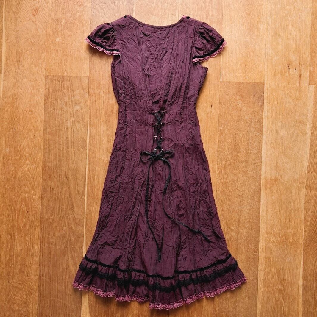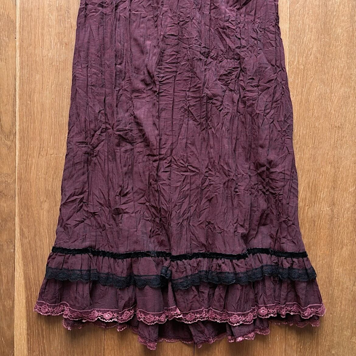 胸元のカシュクールデザインと、裾に施されたブラックレースがクラシカルなアクセント。