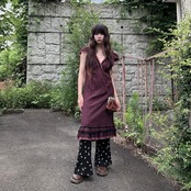 ワインレッド×レースのコンビがロマンティックなフェミニンワンピース。