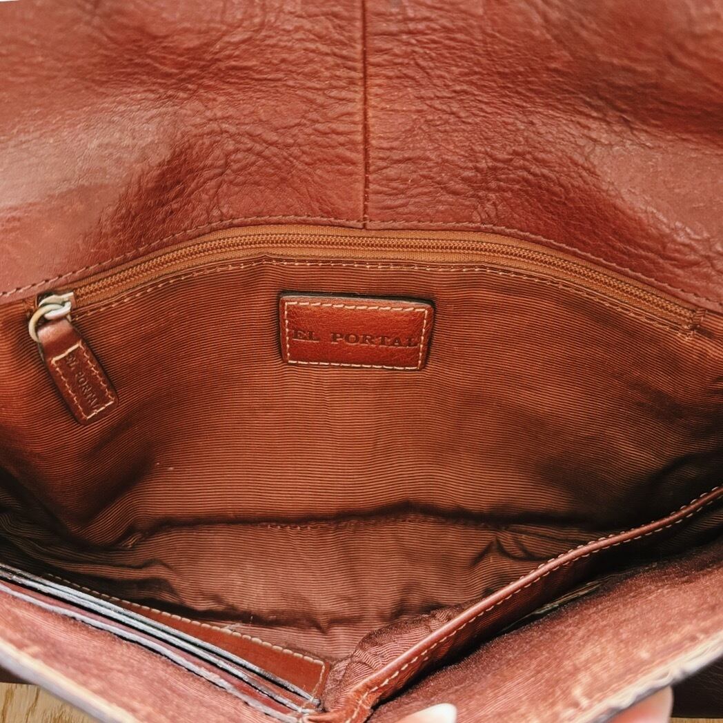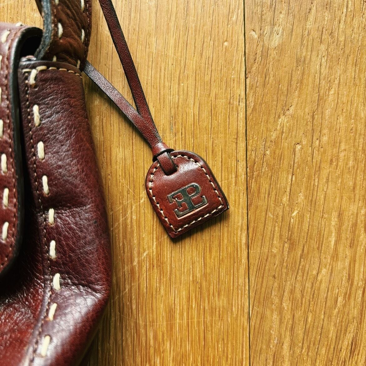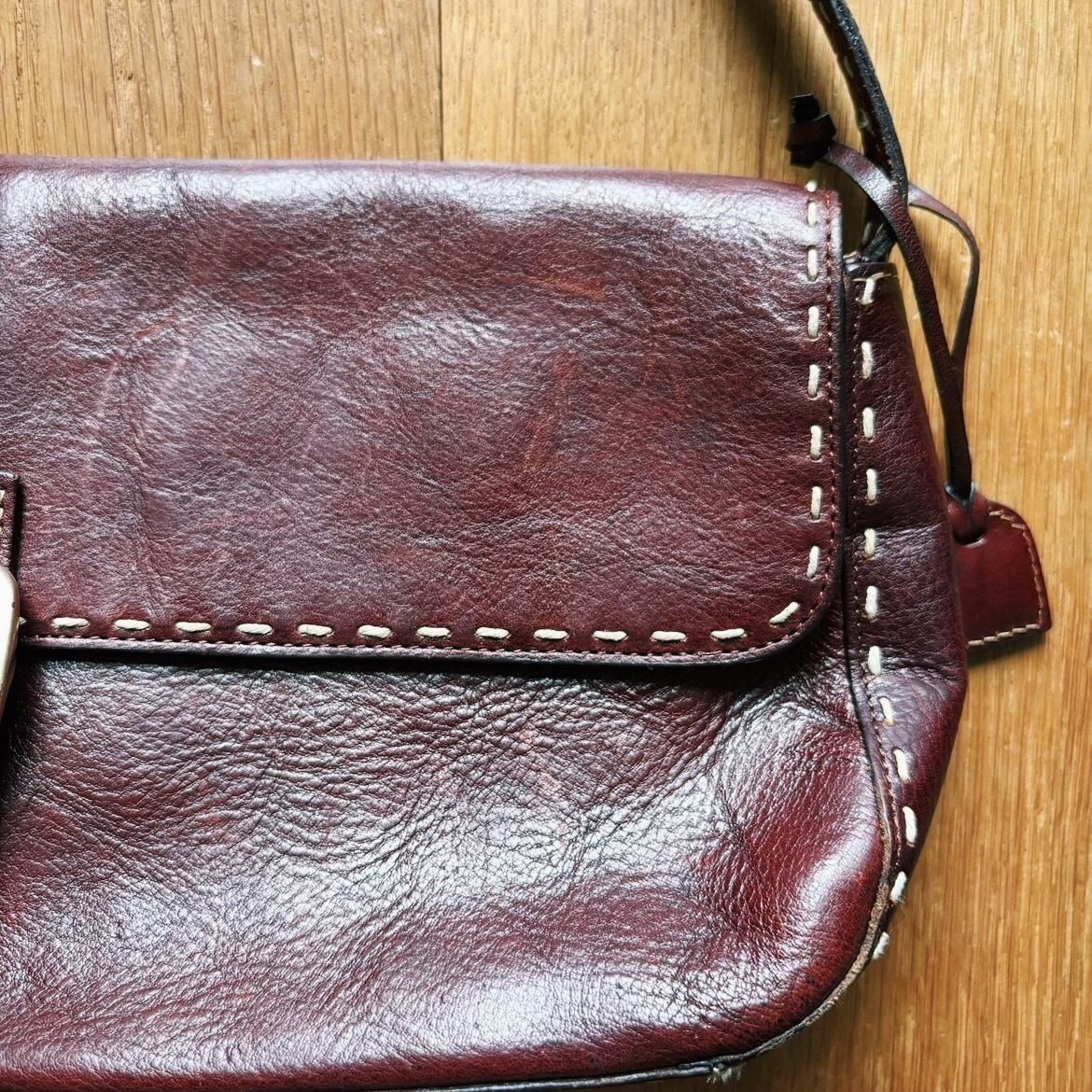 赤みのあるブラウンカラーが印象的なレザーバゲットバッグ。