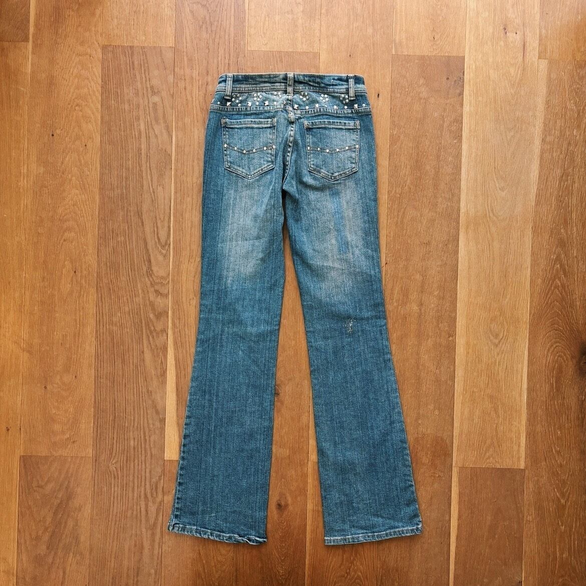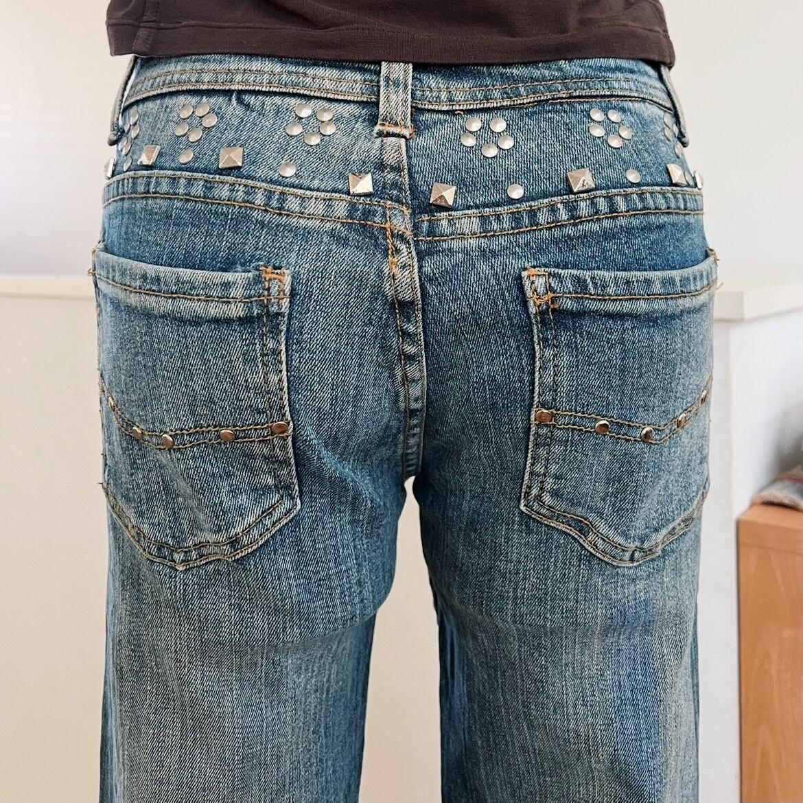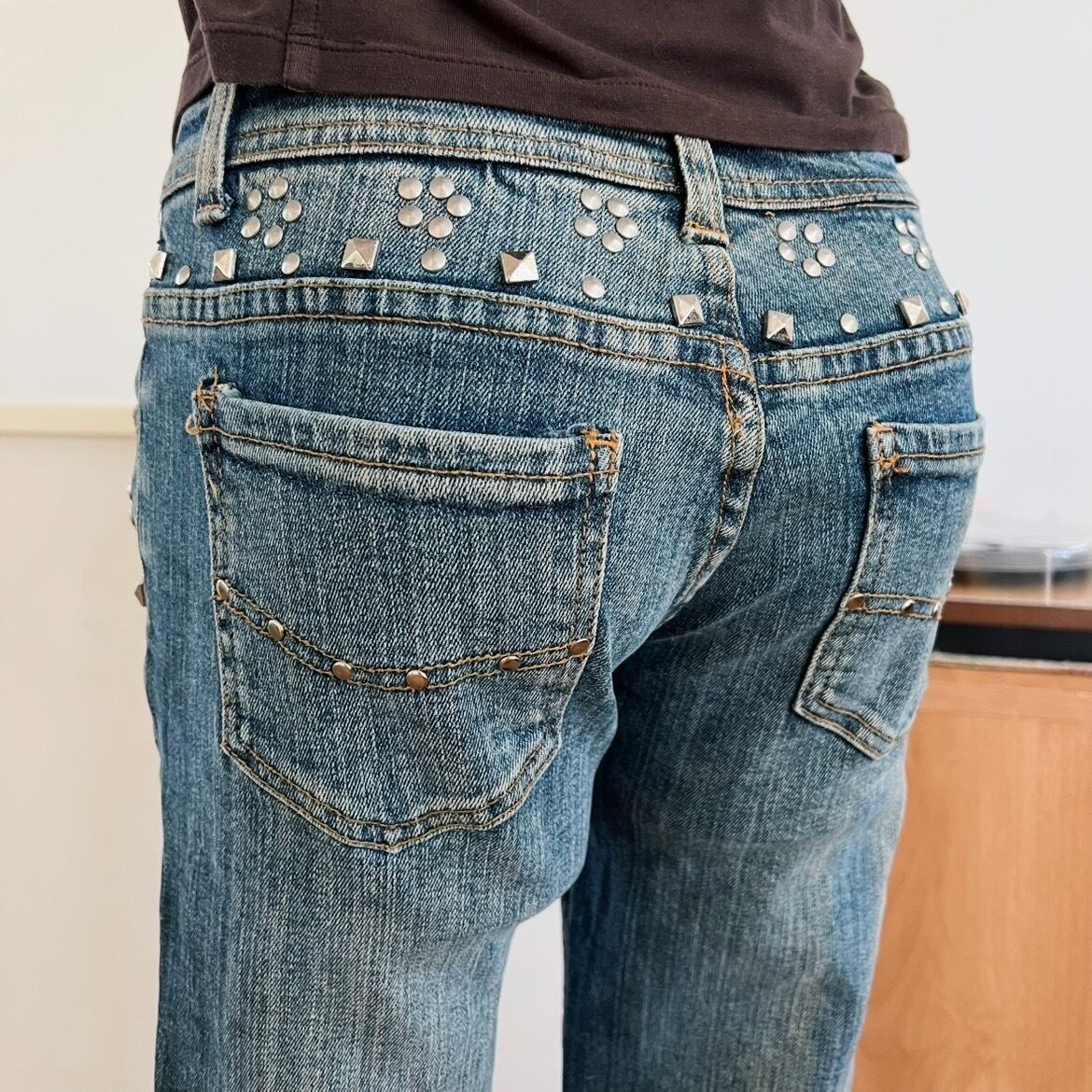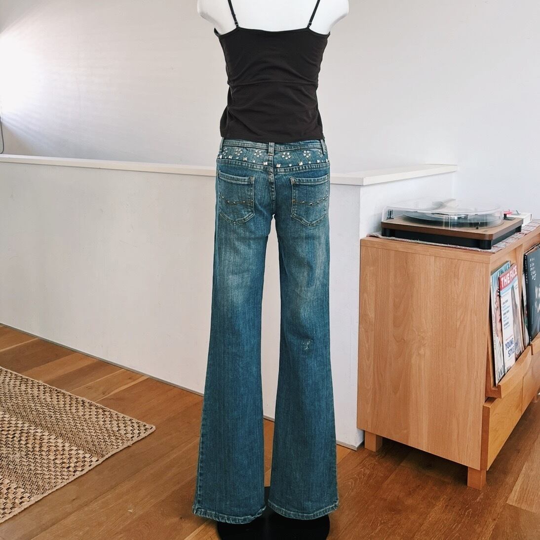 ラインストーンがちりばめられた、00sムード漂うローライズブーツカットデニム。
