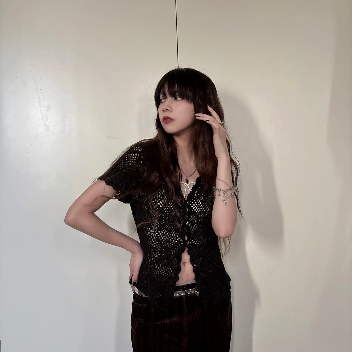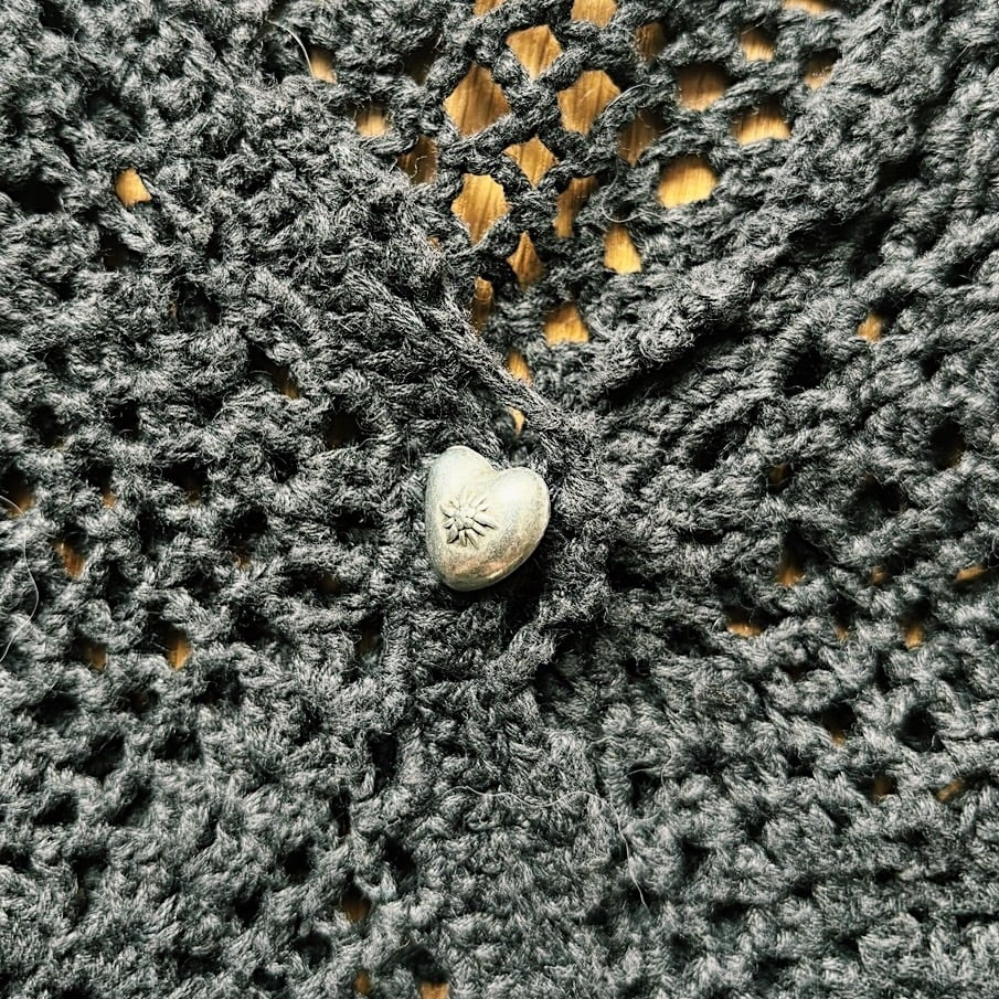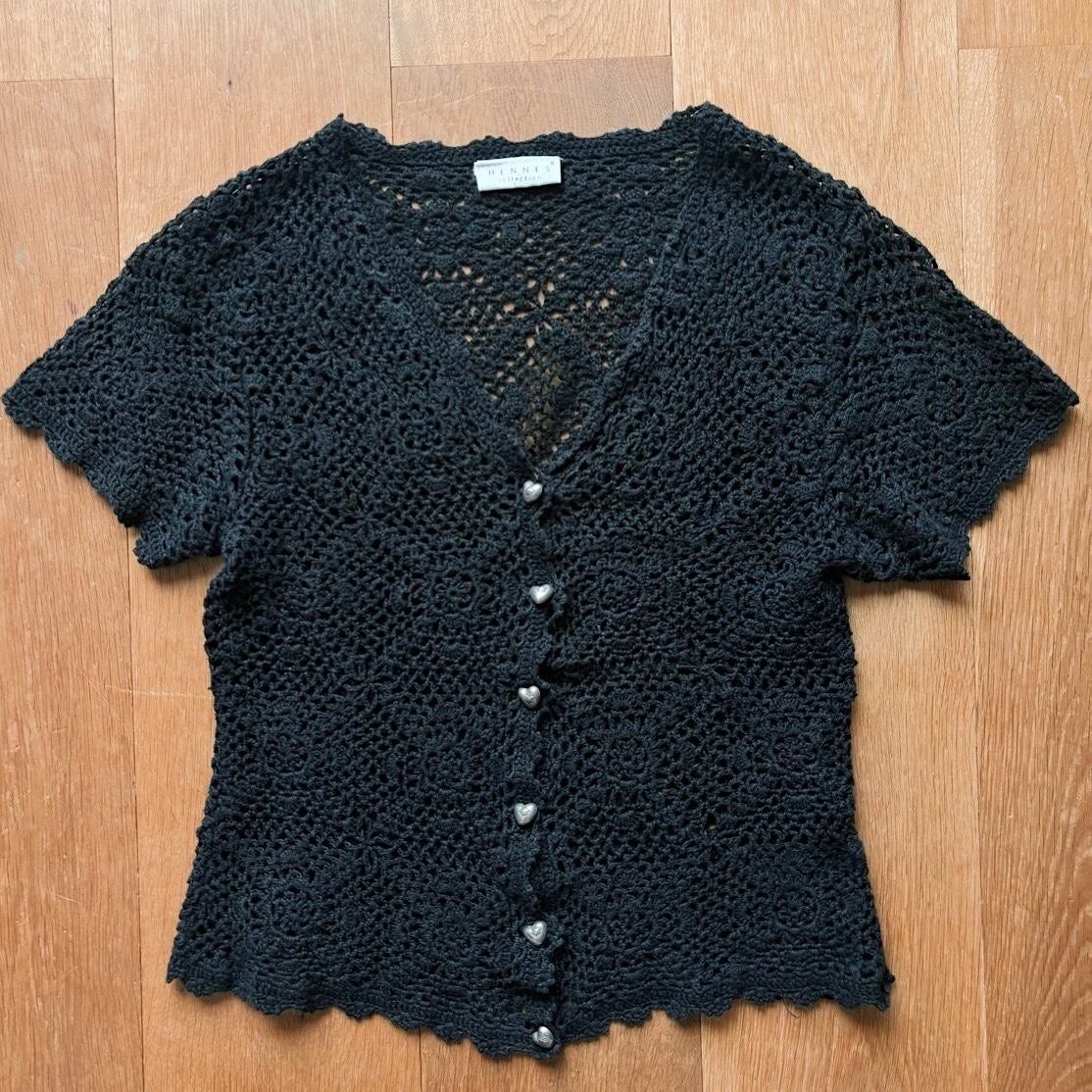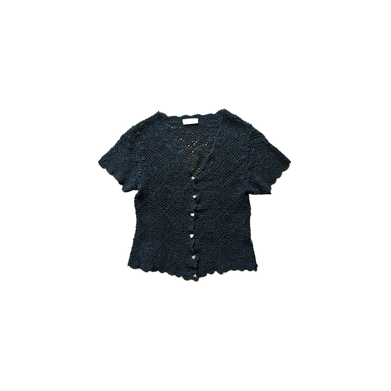 透かし編みにハートのボタンがかわいいカーディガン風ニットトップス。
