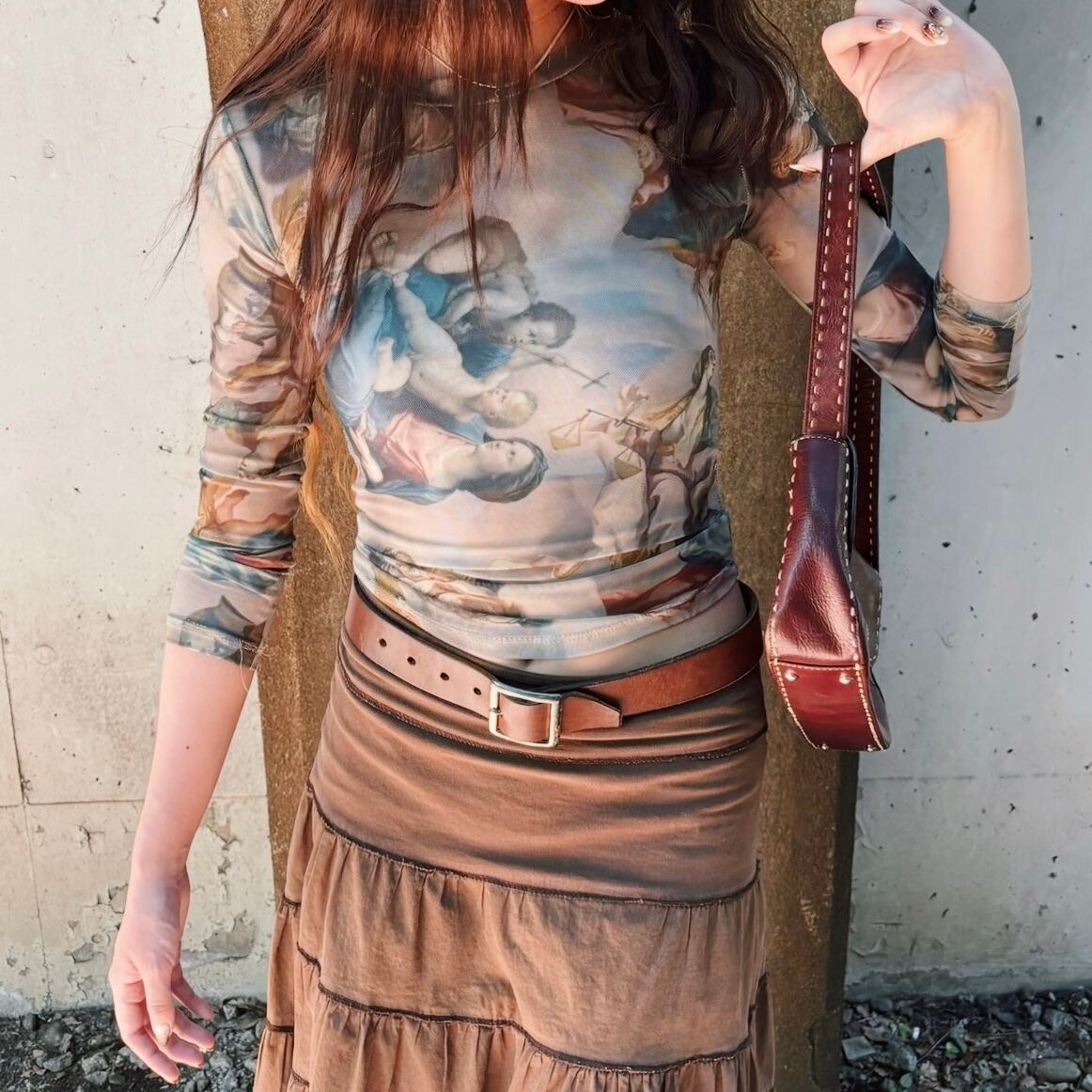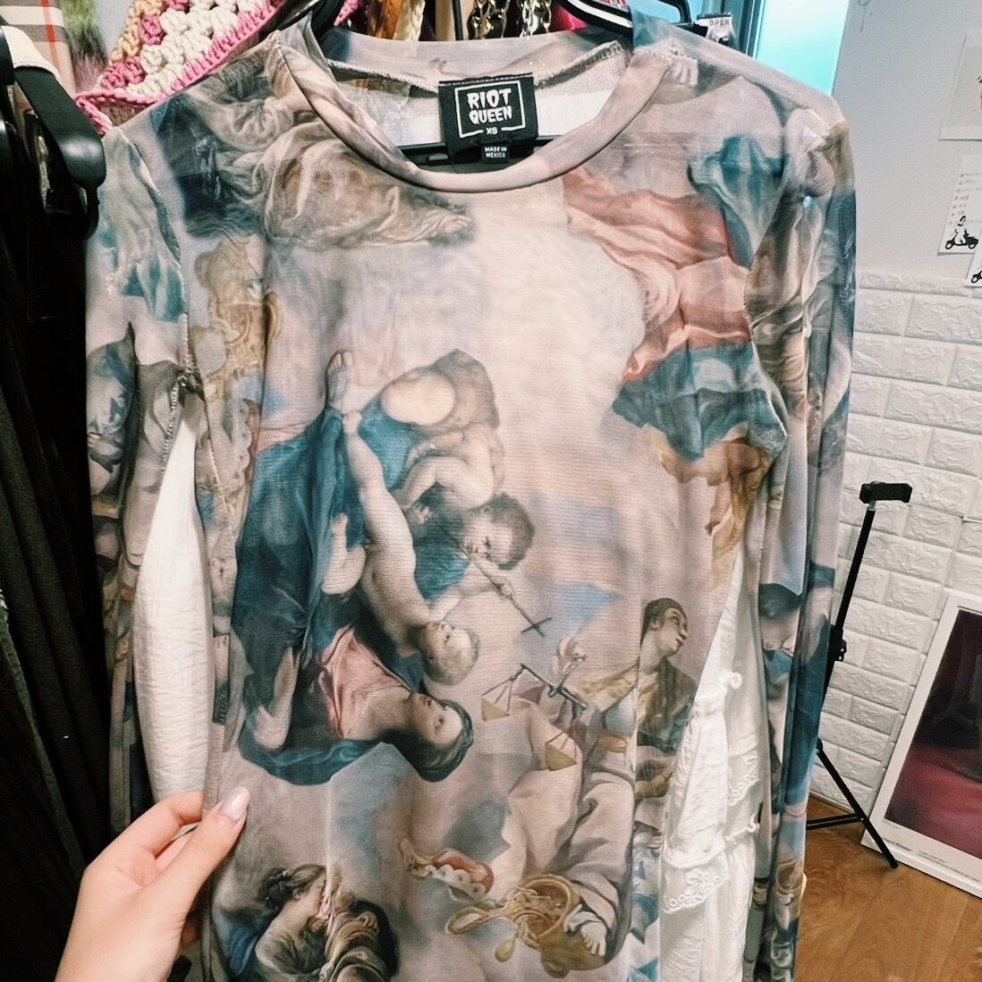 幻想的な天使のプリントが全面に広がるシアーメッシュトップス。
