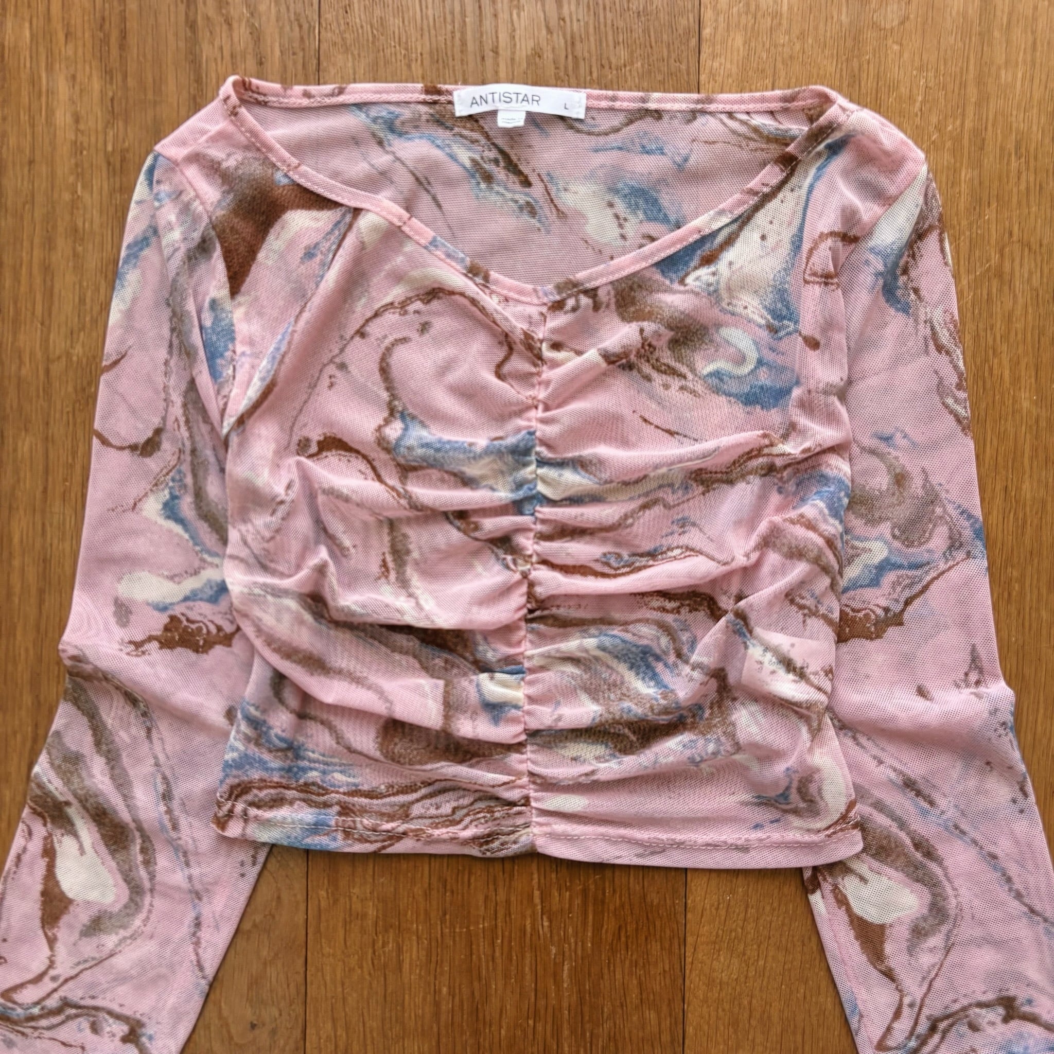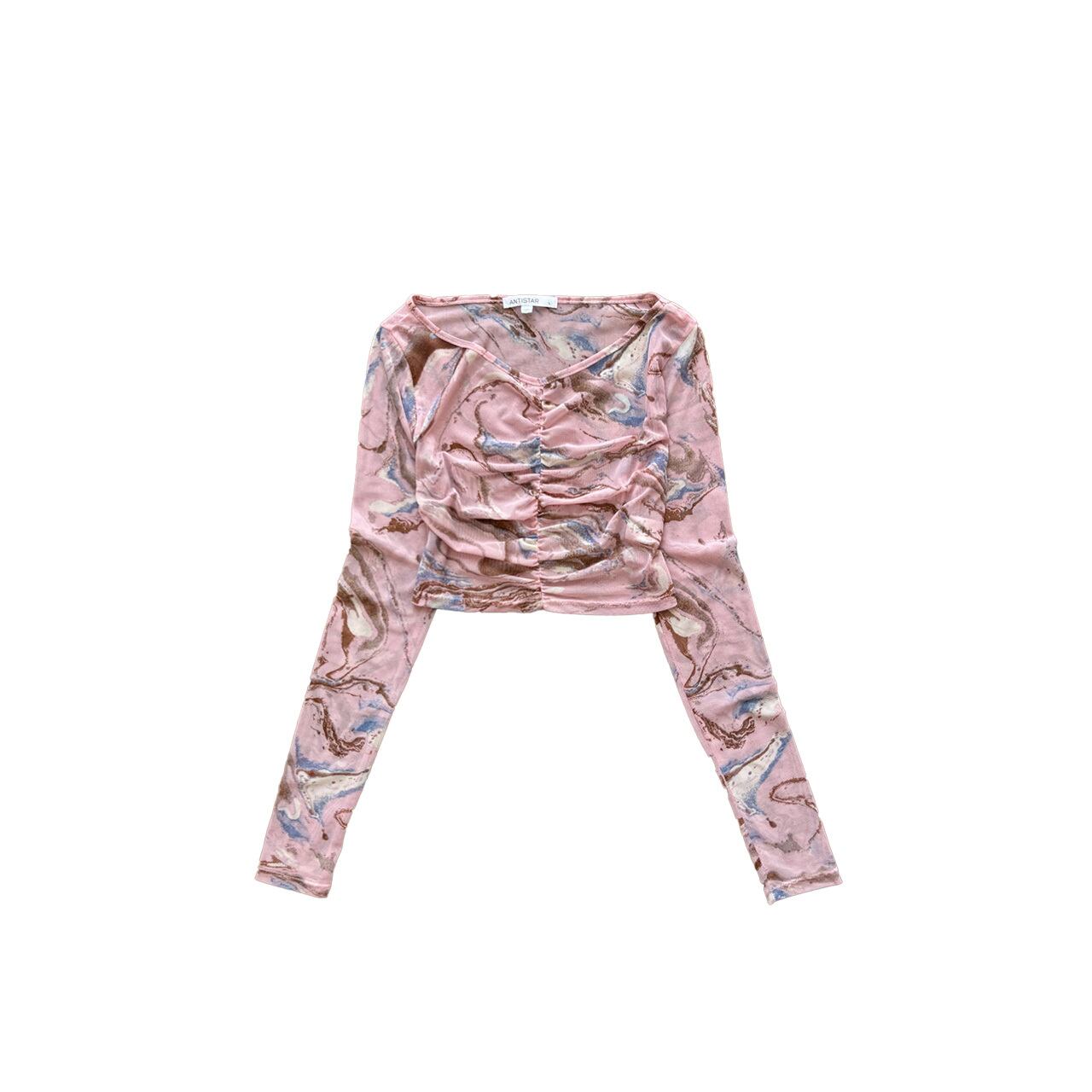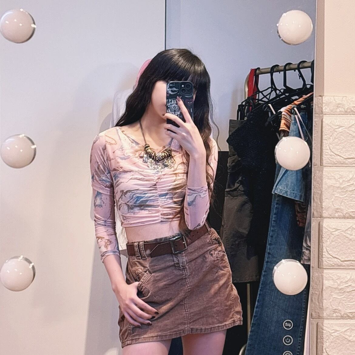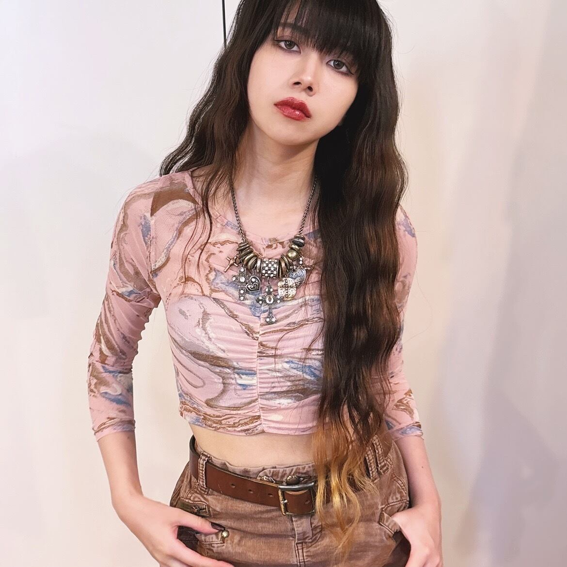 Vネック+フロントギャザー、クロップド丈とY2 K mood漂う1着。