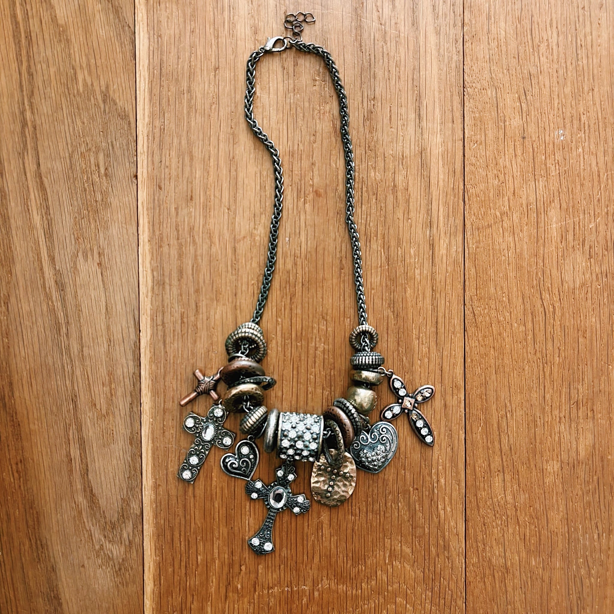 ハートやクロスが重なるチャームがかわいいボリュームネックレス。