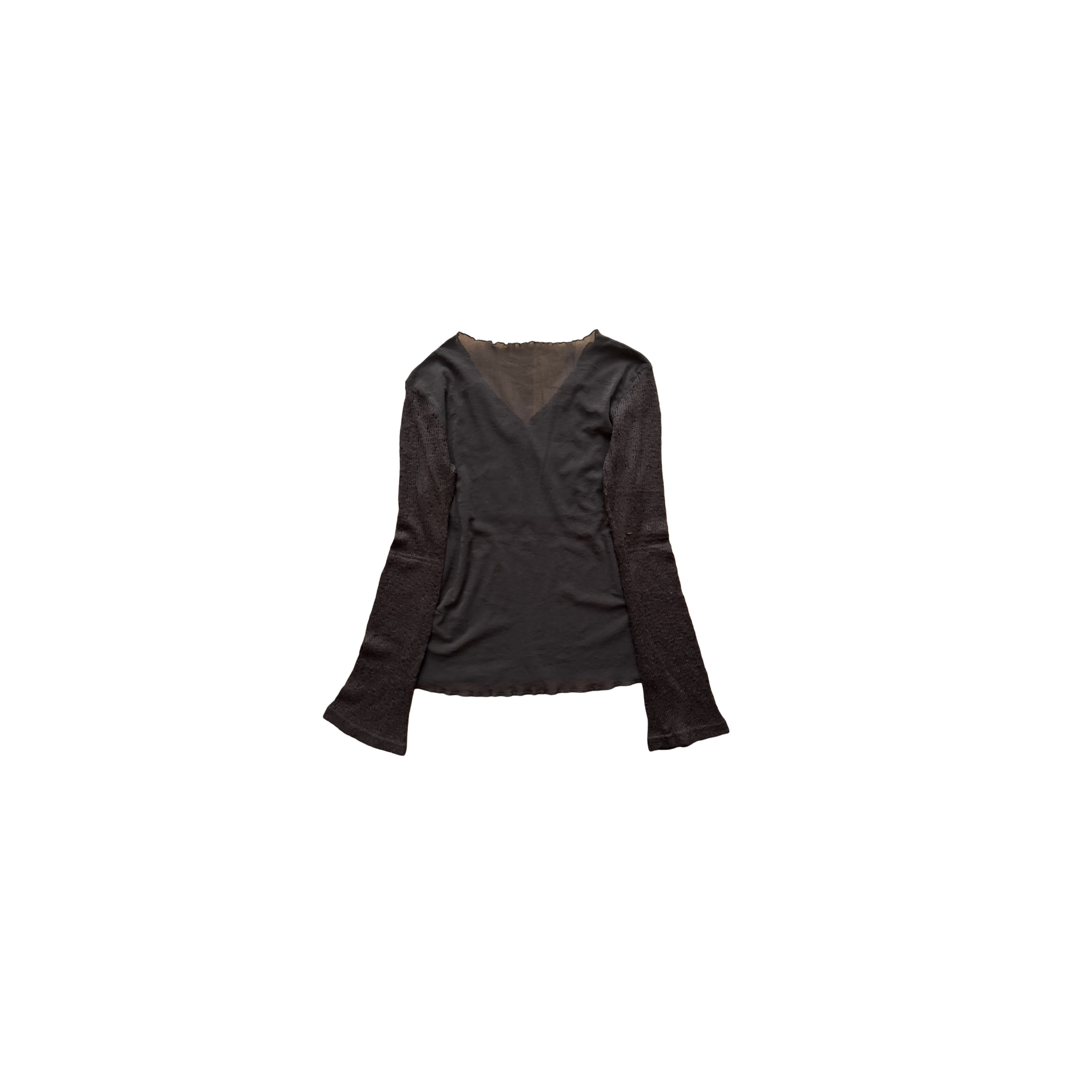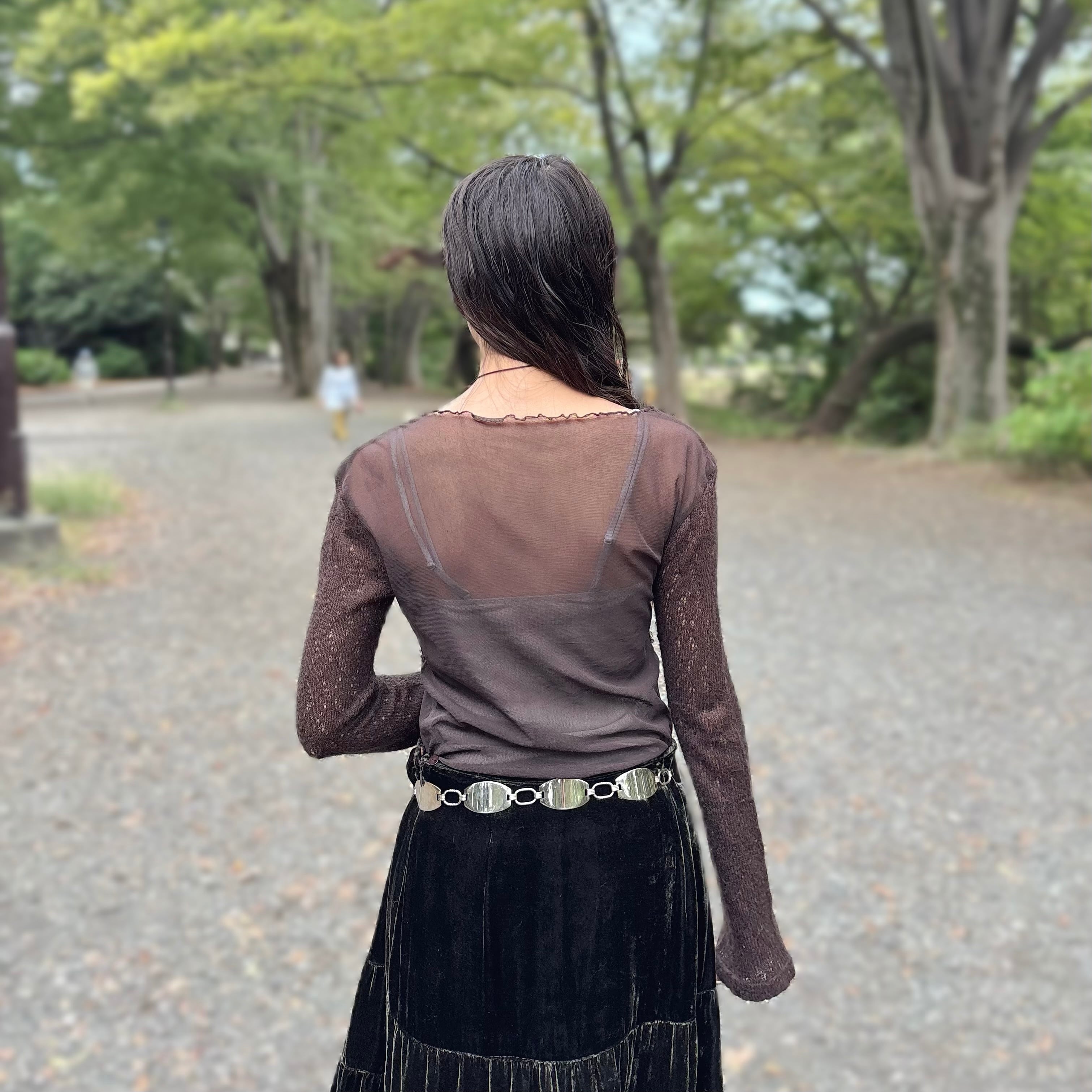 上身頃のシャーリングニット素材と、下身頃のシースルー生地の異素材切り替え。