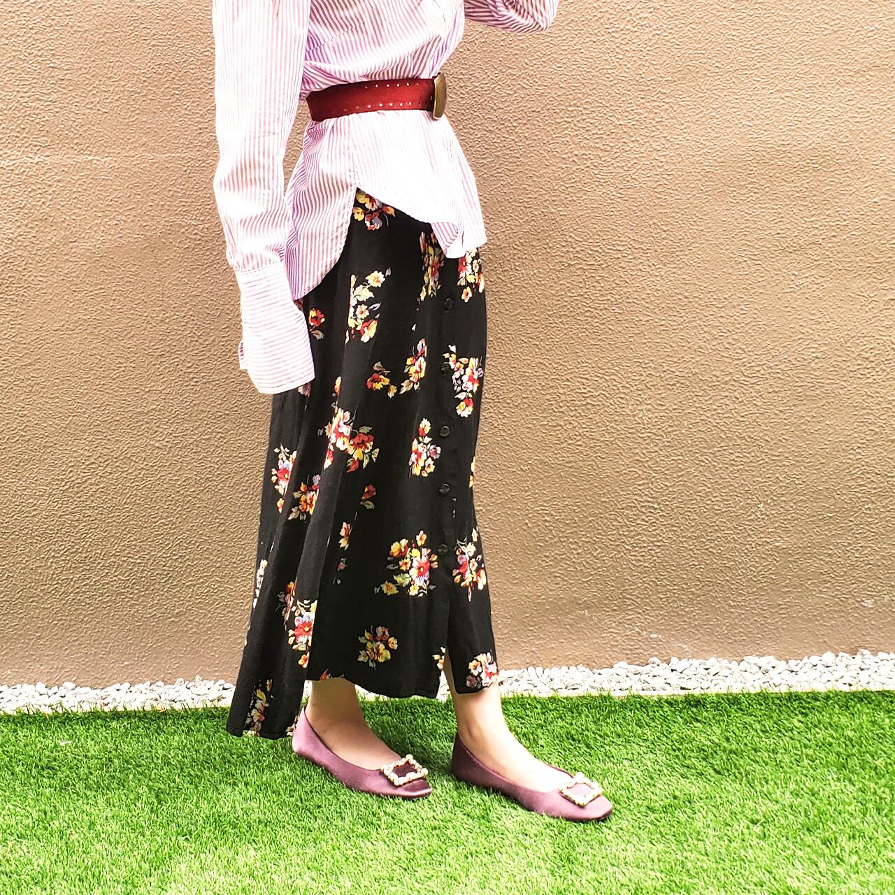 ナチュラルなドレープ感のある生地が裾にかけて垂れ落ちるようなフレアスカート