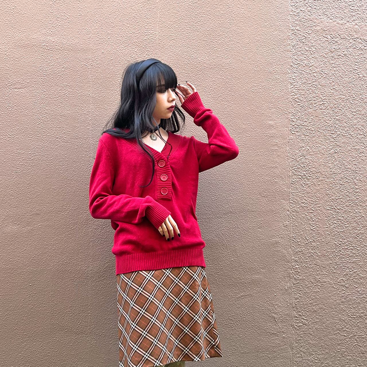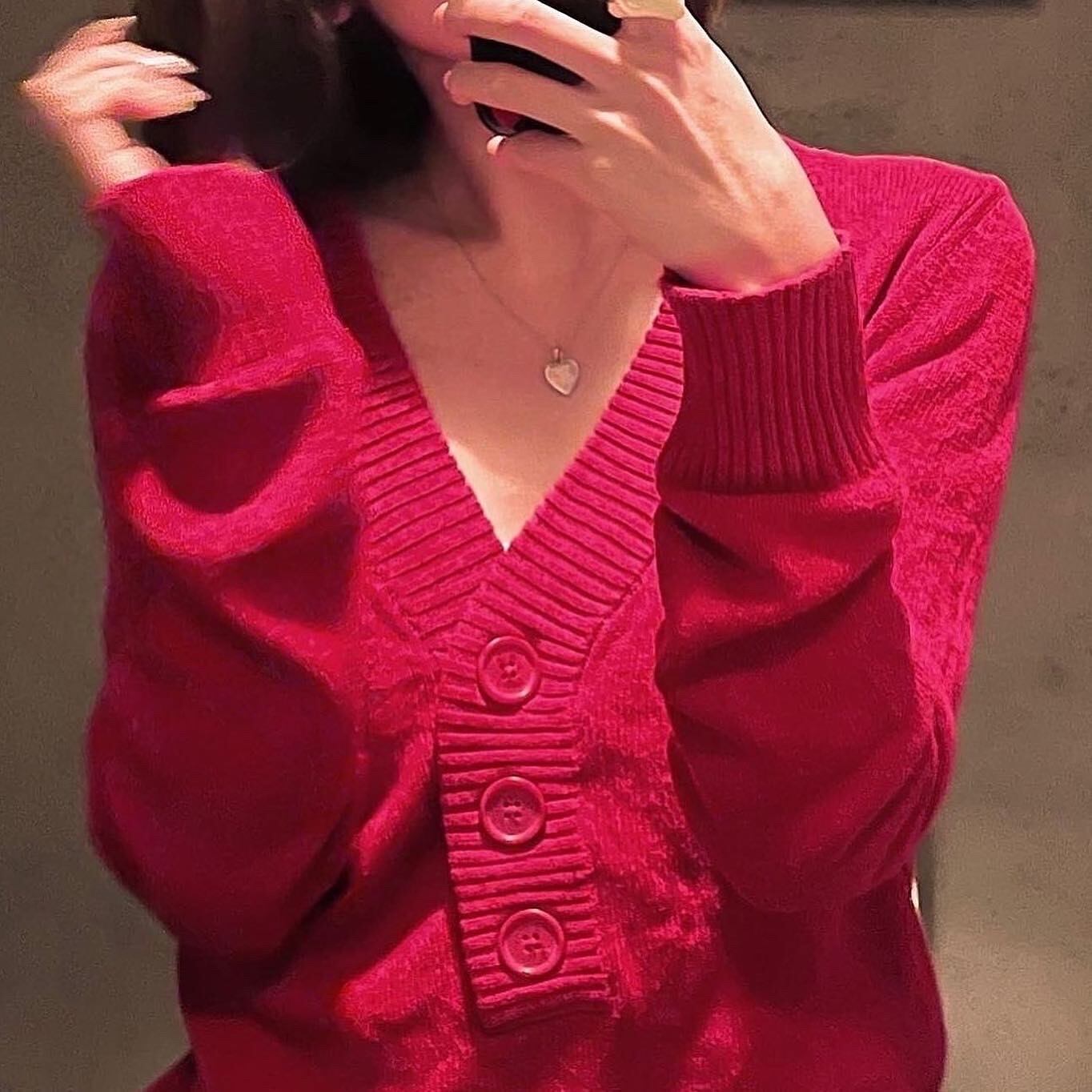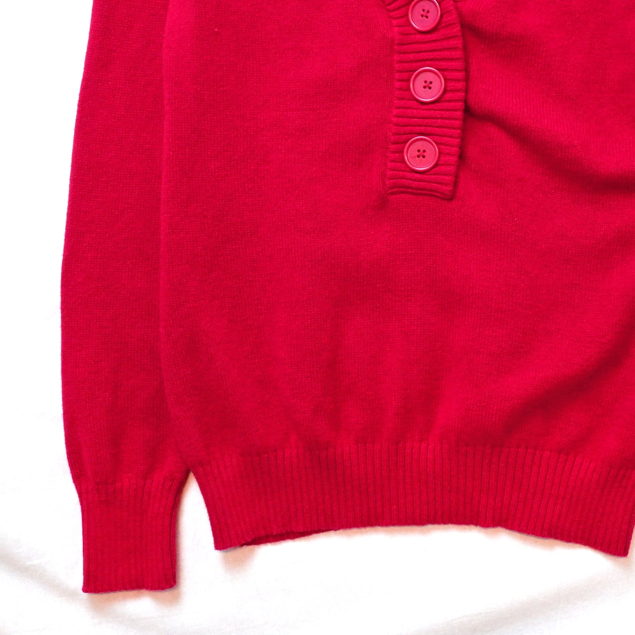 おおきな3つボタンがなんともかわいい赤ニット。