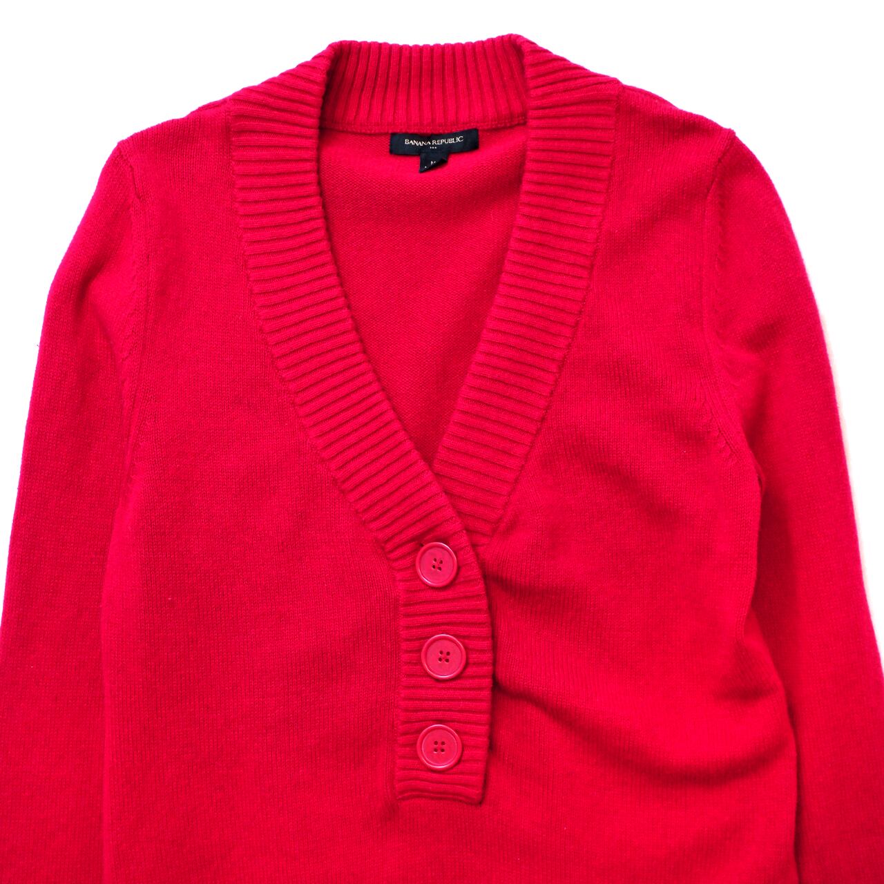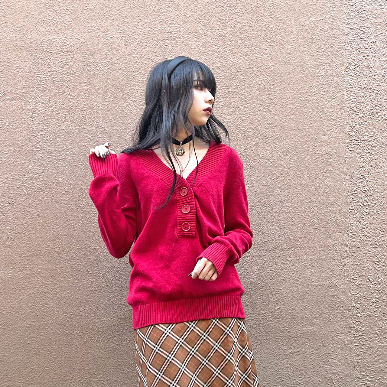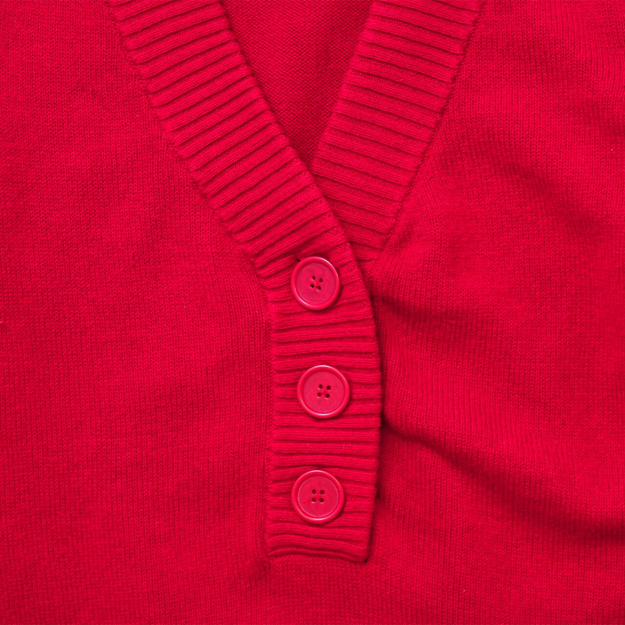 おおきな3つボタンがなんともかわいい赤ニット。