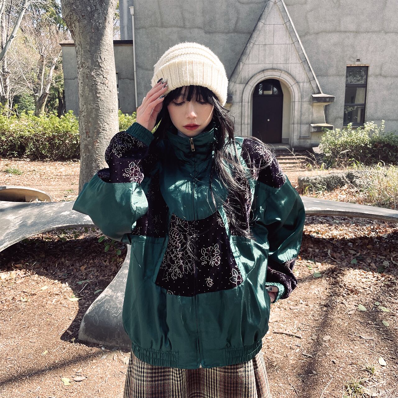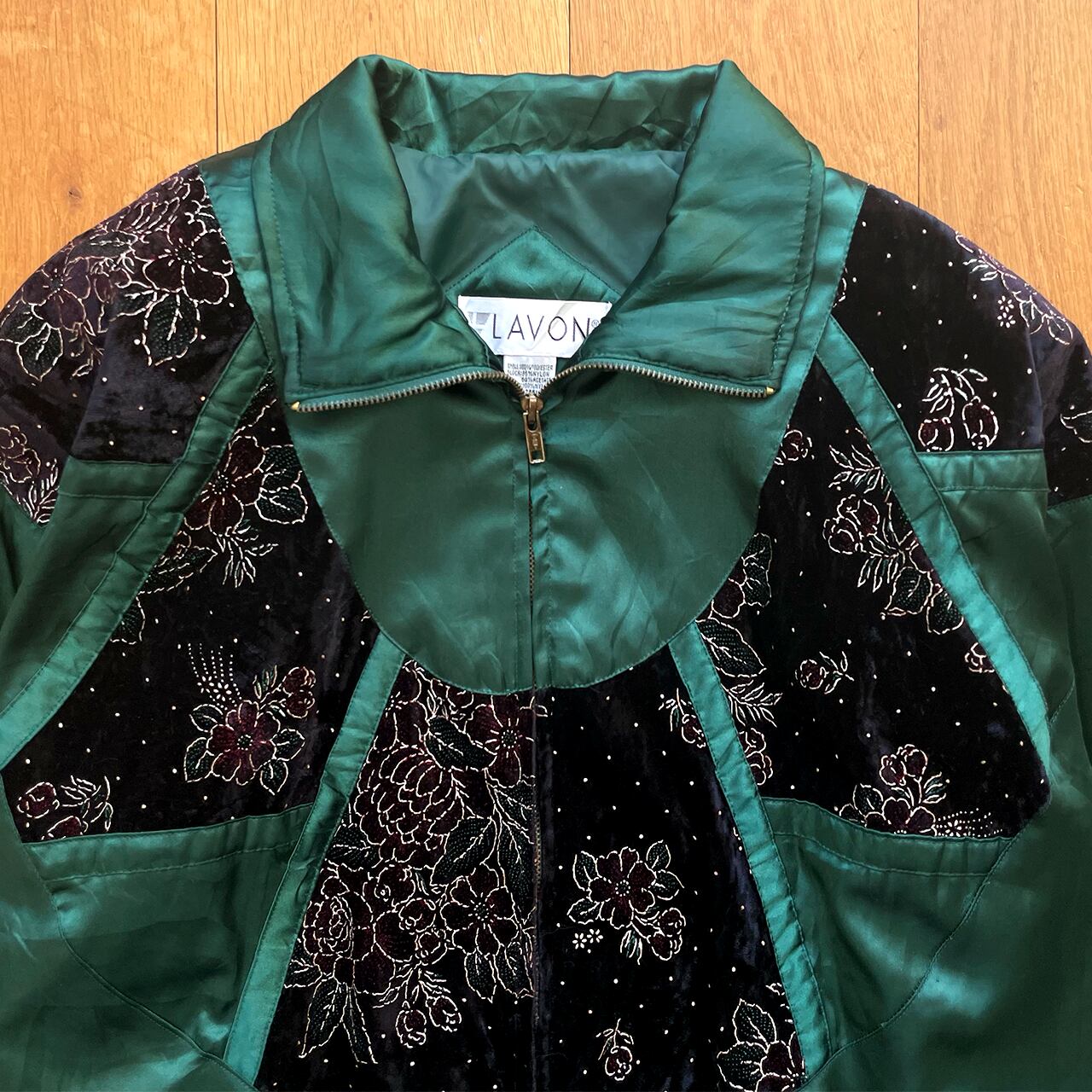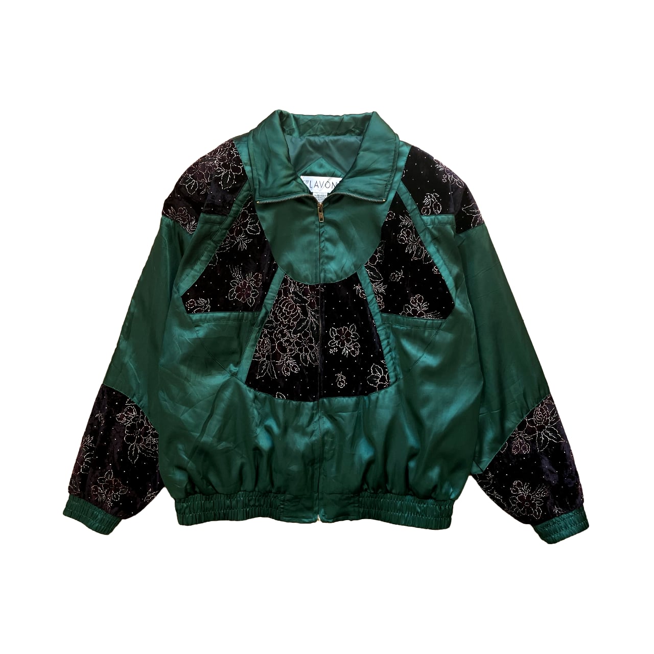 光沢感のある緑に異素材のお花柄がなんともかわいいナイロンジャケット。