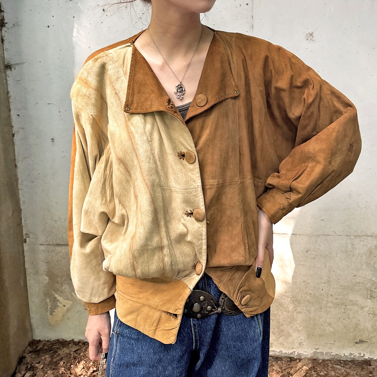 ベージュ×ブラウンのバイカラーにスウェードとファーの組み合わせがなんともかわいいヴィンテージジャケット。