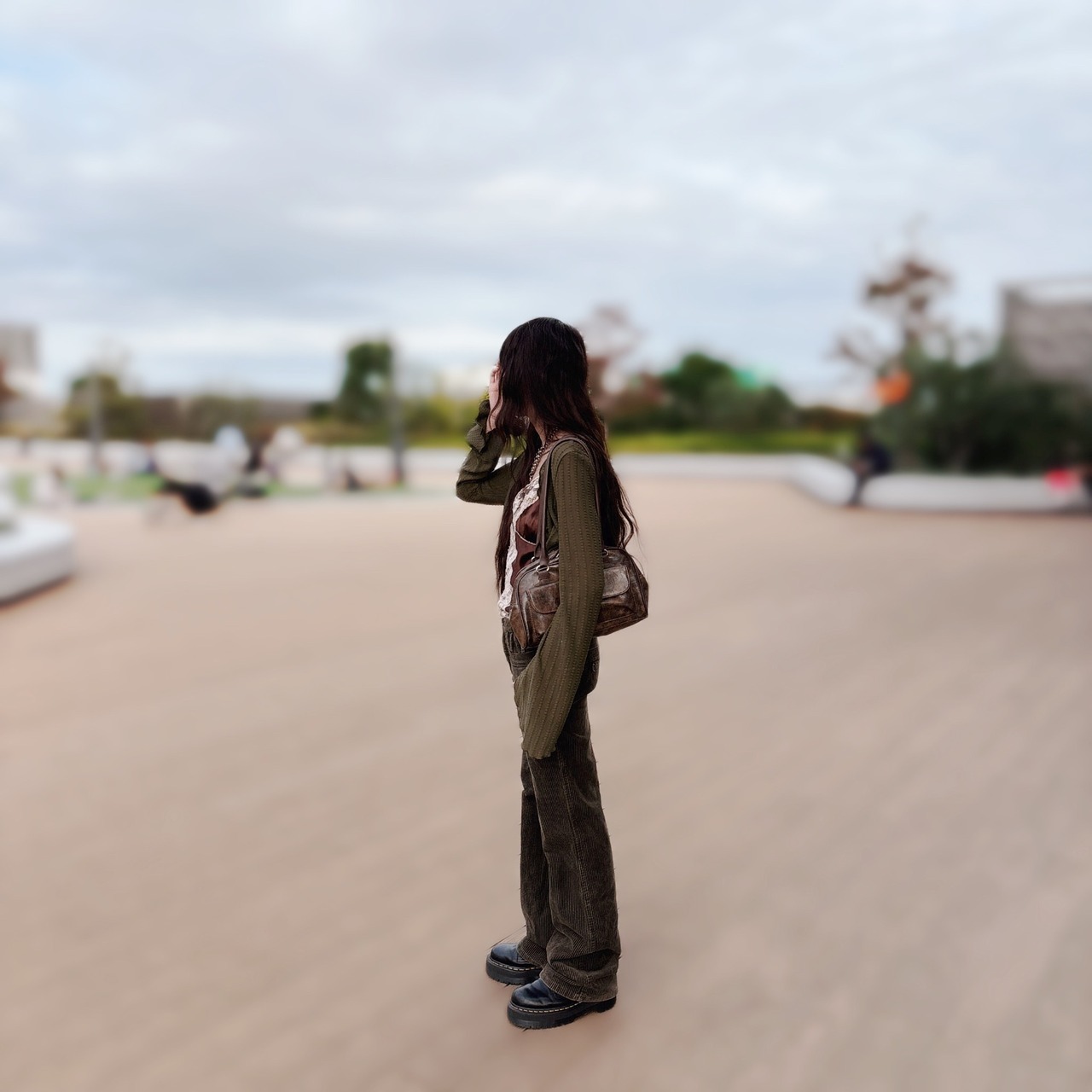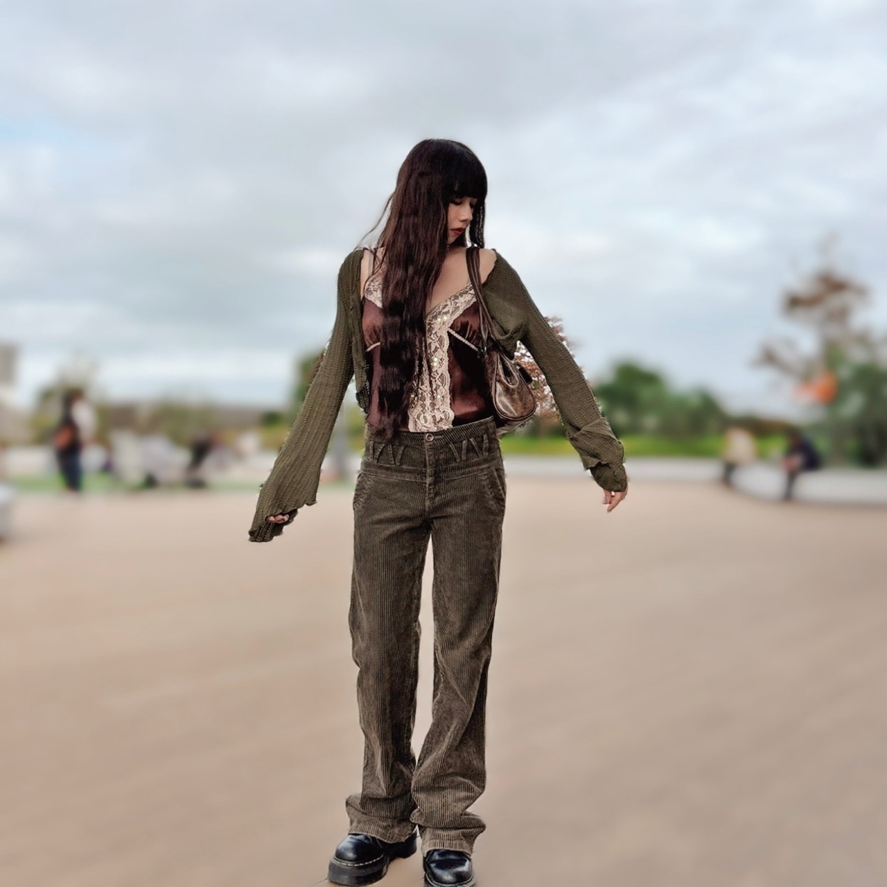 深いカーキがかわいい色味のコーデュロイパンツ。